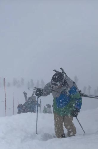 「上百人跌跌撞撞地頂著風雪爬上山,有的撐著雪杖,有的直接拿著滑雪板借力,大家都有些狼狼狽。回度假村必須要翻過一道山脊,好在山不算高,爬了半個小時上去的,這趟滑雪算是體驗感拉滿了。」